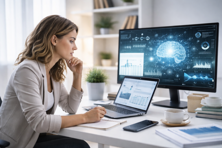 A produtividade é a base do sucesso a solo. Ferramentas como o Notion AI funcionam como um verdadeiro “segundo cérebro”. Elas ajudam a planear, documentar e resumir páginas extensas, centralizando todo o teu conhecimento num espaço de trabalho inteligente e acessível.